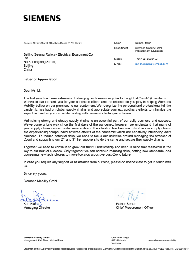 西門子交通有限公司CFO授予北京森瑪?shù)母兄x信